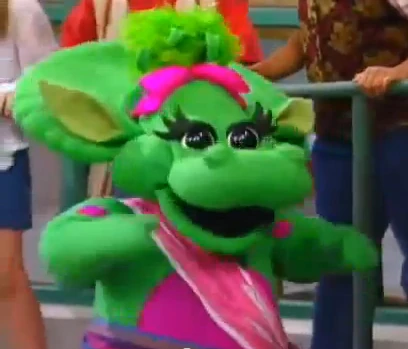 A smaller and shorter concept of the first costume: Baby Bop becomes shorter, fitting her age of two (later three) years old. Some light changes were made. Her eyes and pupils become bigger and more rounded. Her stomach also becomes rounder. In 1994, she gained darker magenta spots. Her nostrils also became bigger. The performer must lean her head down for the whole face to be visible, like the previous costume. This was also the first time Jeff Ayers performed Baby Bop and would continue to do so until 2008. Like BJ's 1994 costume, this suit was also used on live appearances and Barney Books until 1995. | ||
