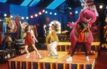 Barney, alongside English model and actress Emma Noble and a few other ladies, at the UK premiere of Barney's Great Adventure in London in June 1998.