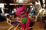 Sheryl Leach, creator of Barney, and Barney on the set of Miss Goldfinch's House during the production of Barney's Great Adventure.